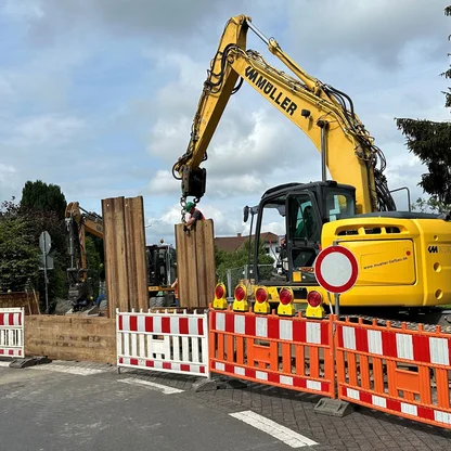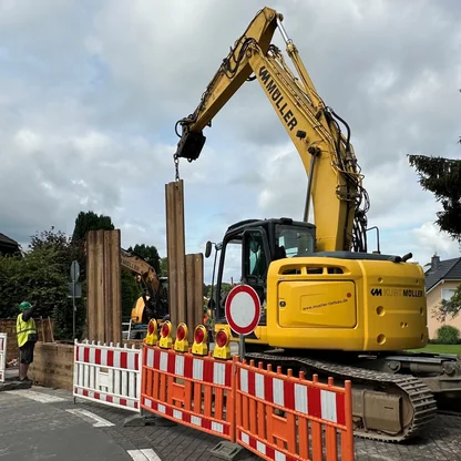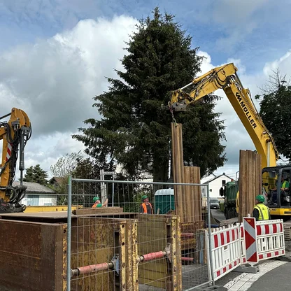 Aufgrund der erforderlichen Grabentiefen bis über 4 m und querender Leitungen kam hier die Grabensicherung mit Kanaldielenverbau zur Ausführung.