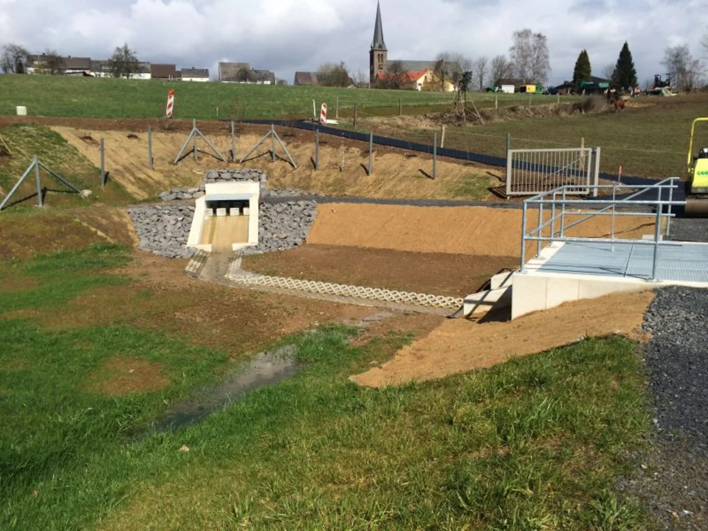 - Einlaufbauwerk mit Tosbecken und Auslaufbauwerk mit Drosselschieber aus Stahlbeton