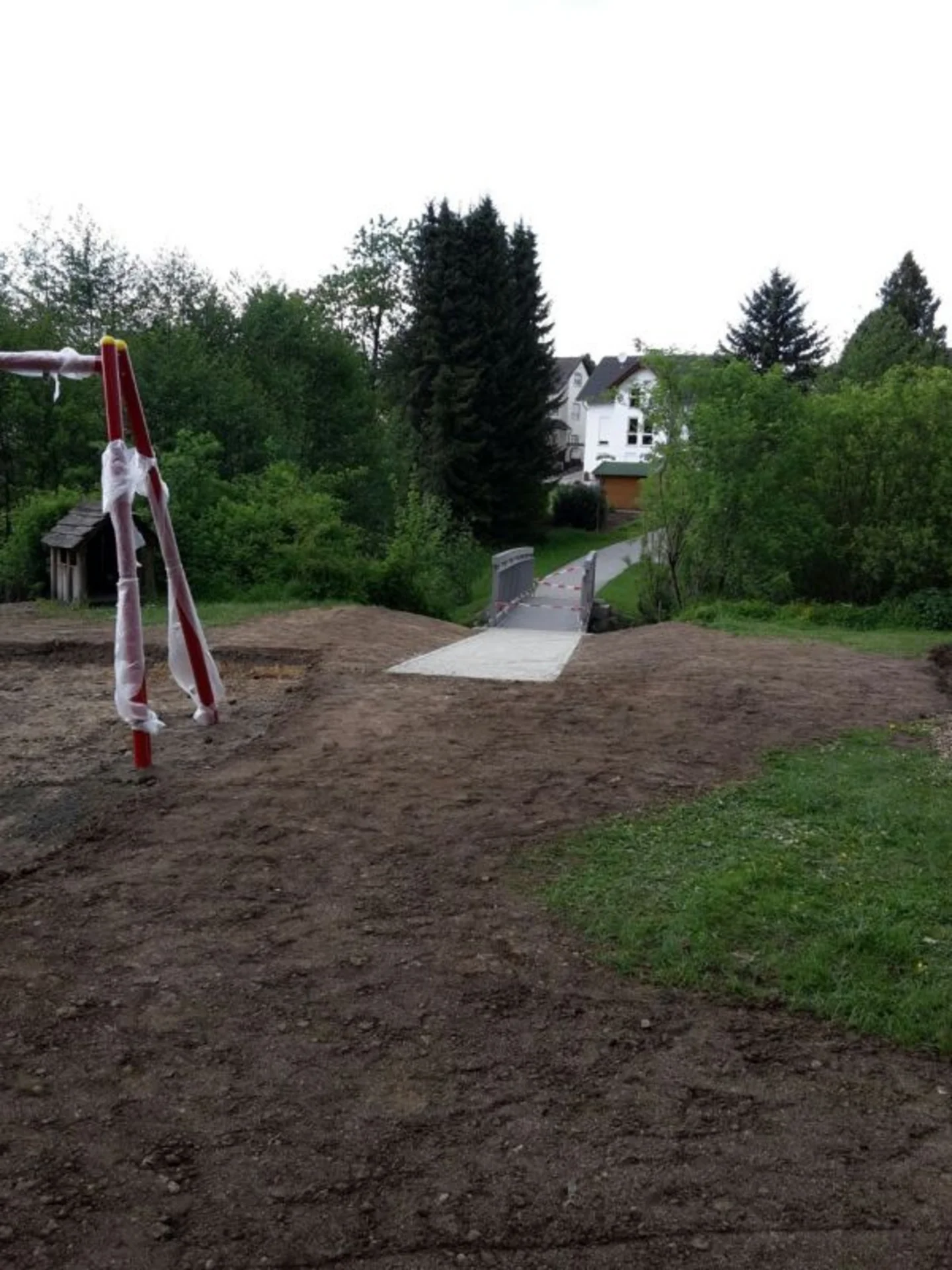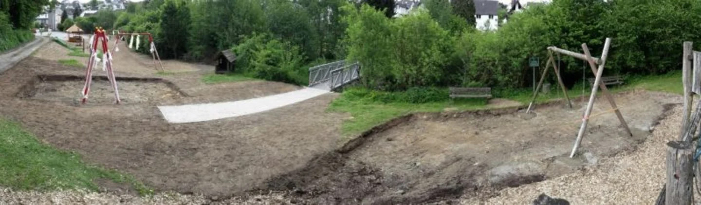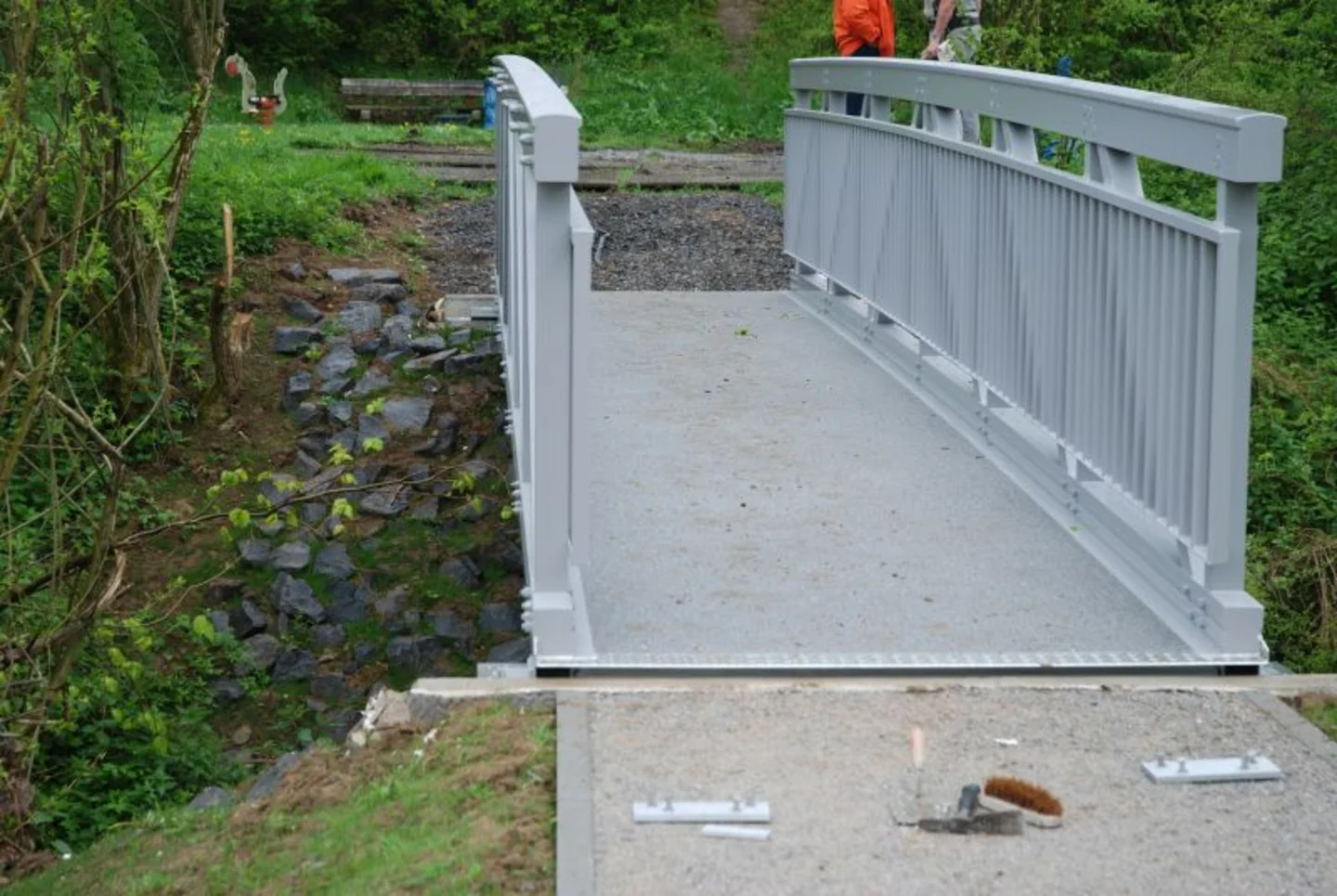 Für die Gründung der Brückenwiderlager unterhalb des Wasserspiegels waren Wasserhaltungsarbeiten erforderlich. Zudem wurde der Bach während der Bauzeit mittels Verrohrung und Fangedamm gesichert. Im Zuge des Projekts erfolgte auch das Aufnehmen und erneute Setzen von Spielgeräten.