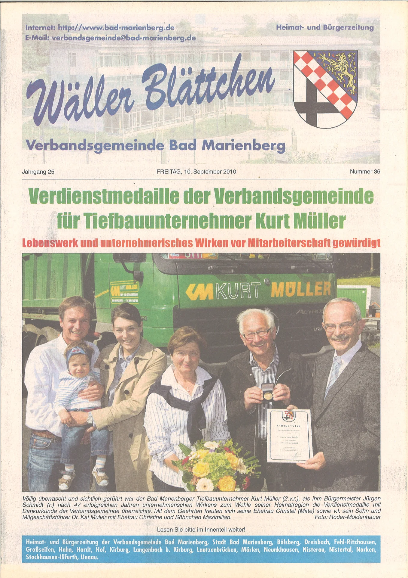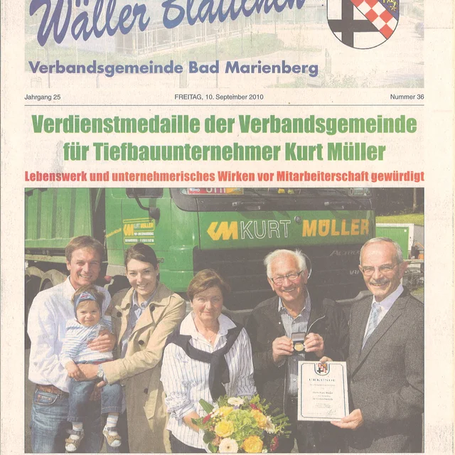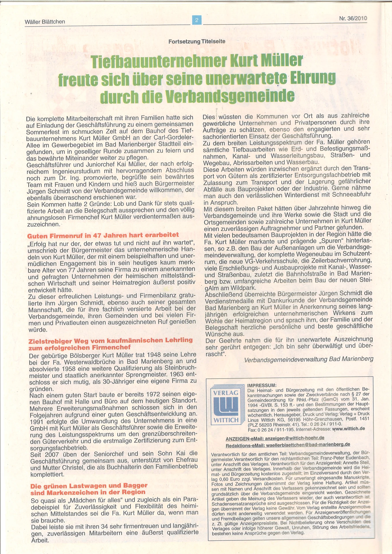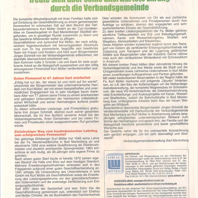 Mit vielen bedeutsamen Bauprojekten in der Region hätte die Fa. Kurt Müller markante und prägende „Spuren" hinterlassen, so z.B. den Bau der Außenanlagen um die Verbandsgemeindeverwaltung, der komplette Wegeneubau im Schulzentrum, die neue VG-Verkehrsschule, die Zeilerbachverrohrung; viele Erschließungs- und Ausbauprojekte mit Kanal-, Wasser und Straßenbau, zuletzt die Bahnhofstraße in Bad Marienberg bzw. umfangreiche Arbeiten beim Bau der neuen SteigAlm am Wildpark.